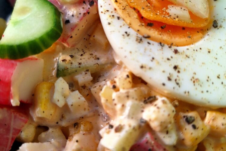 Wszystkie składniki sosu łączymy za pomocą blendera i chłodzimy. Do miski przekładamy odsączoną kukurydzę oraz makaron. Ogórka, cebulę, jajka oraz surimi kroimy w kostkę. Mieszamy z dowolną ilością sosu cezar.