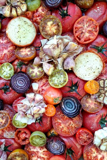 Składniki: 10 pomidorów malinowych,2 pomidory rzymskie,2 pomidory kiściowe,2 pomidory bawole serce,1 garść pomidorków daktylowych,3 główki czosnku,3 czerwone cebule,1 pęczek bazylii,7 łyżek oliwy,sól morska, świeży pieprzPomidory, cebulę i czosnek rozkrawamy w pół. Wszystkie warzywa układamy na blasze wyłożonej papierem do pieczenia. Polewamy oliwą i oprószamy solą oraz pieprzem. Wkładamy do piekarnika nagrzanego to temperatury 180 stopni […]