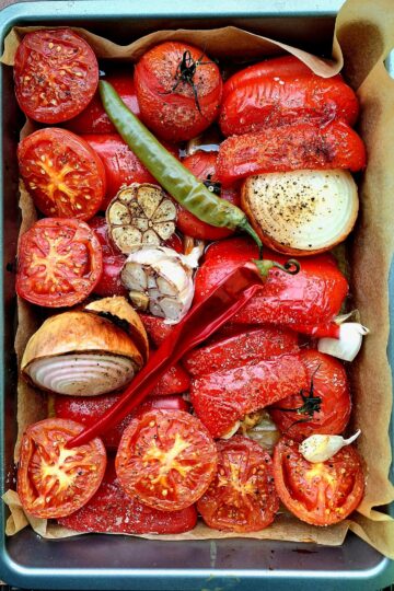 Składniki: 10 pomidorów malinowych,2 pomidory rzymskie,2 pomidory kiściowe,2 pomidory bawole serce,1 garść pomidorków daktylowych,3 główki czosnku,3 czerwone cebule,1 pęczek bazylii,7 łyżek oliwy,sól morska, świeży pieprzPomidory, cebulę i czosnek rozkrawamy w pół. Wszystkie warzywa układamy na blasze wyłożonej papierem do pieczenia. Polewamy oliwą i oprószamy solą oraz pieprzem. Wkładamy do piekarnika nagrzanego to temperatury 180 stopni […]