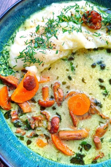 Składniki (4 osoby): 600 g kurek,3 marchewki z rosołu,1 duża biała cebula,3 ząbki czosnku,1 pęczek koperku,2 łyżki masła,2 l pikantnego bulionu warzywnego,200 g gęstej śmietany 18%,1 łyżeczka kurkumy w proszku,sól morska, świeży pieprzPuree ziemniaczane: 1,4 kg ziemniaków,140 g masła,sól morskaW dużym garnku, na maśle podsmażamy pokrojoną w kostkę cebulę. Gdy się zeszkli, dodajemy oczyszczone kurki […]