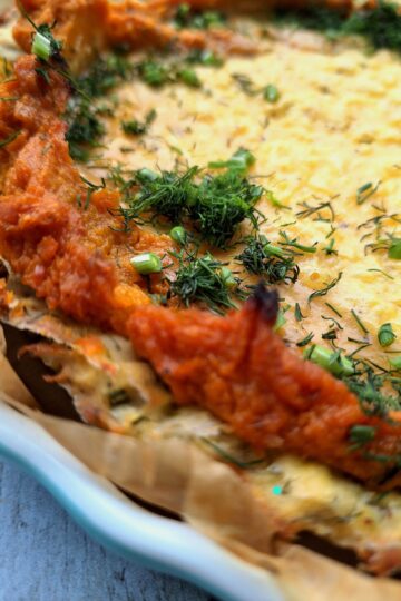 TARTA NA ZIEMNIACZANYM SPODZIE Z PUREE Z DYNI HOKKAIDO I MASĄ JAJECZNĄ NA BAZIE SERA OLD AMSTERDAM