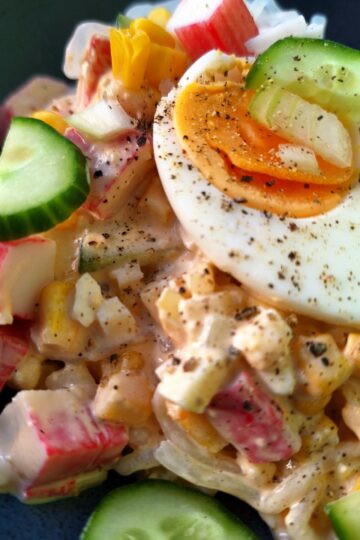 Składniki (4 osoby): 200 g makaronu konjak,300 g paluszków krabowych (surimi),1 świeży ogórek (200 g),1 puszka kukurydzy (285 g),1 mała cebula,5 jajek ugotowanych na twardoOstry sos cezar: 160 ml majonezu,1 łyżeczka musztardy Dijon,1 łyżka sosu Sriracha,1 łyżeczka sosu Worcestershire,2 ząbki czosnku,sok z ½ cytrynyWszystkie składniki sosu łączymy za pomocą blendera i chłodzimy. Do miski przekładamy […]