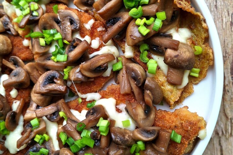 Kotlety delikatnie rozbijamy. Doprawiamy solą, pieprzem i papryką. Odstawiamy na godzinę. Oczyszczone pieczarki kroimy w ćwiartki i podsmażamy na rozgrzanym oleju. Gdy puszczą wodę, solimy. Jajka wbijamy do miski i rozrabiamy widelcem z solą i pieprzem. Mięso obtaczamy w jajku, następnie w bułce tartej i smażymy na rozgrzanym smalcu, z dwóch stron, na złoty kolor. Po usmażeniu przekładamy na ręcznik papierowy, aby wchłonął nadmiar tłuszczu. Smażymy też jajko (jeśli zostało). Kotlety układamy w żaroodpornej formie, posypujemy serem i pieczarkami. Zapiekamy w temperaturze 190 stopni C (góra, dół) przez około 10 minut. Po wyjęciu posypujemy posiekanym szczypiorkiem.