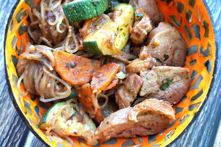 Piersi z kaczki oczyszczamy, skórę nacinamy w kratkę. Osuszamy i nacieramy solą, pieprzem oraz kolendrą. Wkładamy na noc do lodówki. Po tym czasie wyjmujemy z lodówki i doprowadzamy do temperatury pokojowej. Wszystkie składniki sosu łączymy ze sobą za pomocą rózgi. Rozgrzewamy suchą patelnię. Piersi kaczki kładziemy skórą do dołu i smażymy około 8 minut. Następnie przekładamy na drugą stronę na kolejne 6 minut. Mięso przekładamy na deskę do krojenia na 10 minut, aby odpoczęło. Kroimy je w plastry (powinno być różowe w środku). W międzyczasie gotujemy makaron według instrukcji na opakowaniu. Na patelni, na rozgrzanej oliwie podsmażamy pokrojone w plasterki warzywa. Po dwóch minutach dokładamy ugotowany oraz odcedzony makaron wraz z 5 łyżkami wody z gotowania. Całość zalewamy sosem orzechowym i doprowadzamy do wrzenia. Gdy składniki się połączą, wykładamy na talerze wraz z kawałkami kaczki.