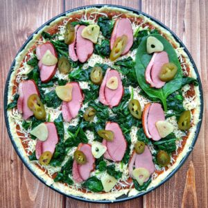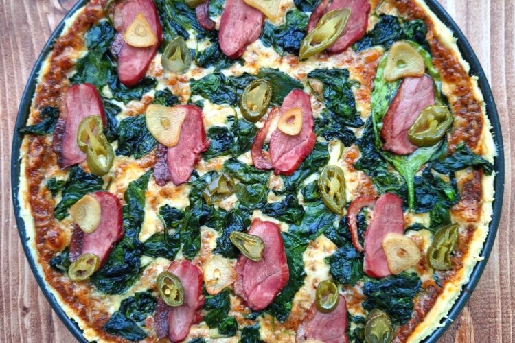 Wszystkie składniki sosu pomidorowego łączymy za pomocą blendera. Drożdże rozpuszczamy z cukrem w ciepłej wodzie i dodajemy 1/3 przesianej mąki oraz sól. Odstawiamy na 10 minut aż rozczyn urośnie. Gdy urośnie, łączymy go z resztą mąki oraz oliwą. Wyrabiamy do momentu aż ciasto będzie jednolite i elastyczne. Przekładamy do miski, nakrywamy ściereczką i odkładamy na godzinę w ciepłe miejsce. Blachę smarujemy oliwą i od środka ku brzegom rozciągamy na niej wyrośnięte ciasto. Trwa to chwilę, ponieważ ciasto potrzebuje czasu. Również od środka okrężnymi ruchami rozprowadzamy na blacie sos pomidorowy. Całość posypujemy startym serem mozzarella oraz radamer. Na patelni, na rozgrzanej oliwie z dodatkiem masła, podsmażamy pokrojony w plasterki czosnek oraz szpinak. Gdy szpinak zwiędnie, doprawiamy go solą i pieprzem. Równomiernie rozkładamy na blacie podsmażony szpinak, plasterki kaczki i papryczek. Blat wkładamy do pieca nagrzanego do temperatury 220 stopni C (góra, dół) i pieczemy przez 20 minut.