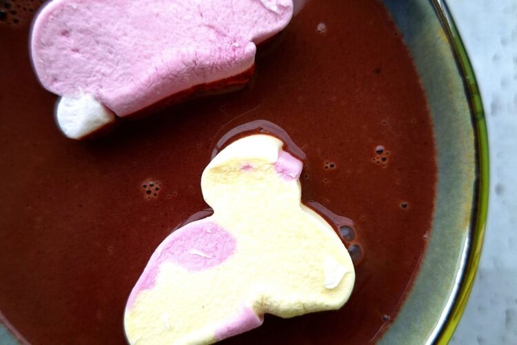 Mleko i śmietankę przelewamy do rondelka i podgrzewamy na małym ogniu (nie zagotowujemy). Do ciepłych składników dodajemy pokruszoną czekoladę i mieszamy za pomocą rózgi. Gorącą i jednolitą przelewamy do filiżanki. Podajemy z piankami.