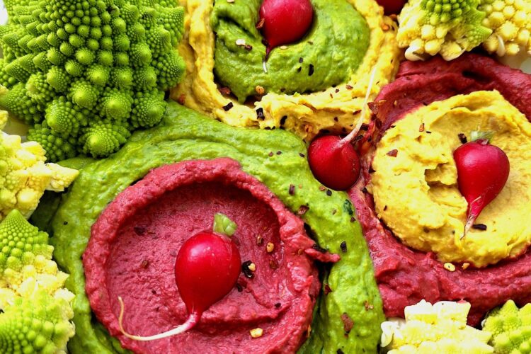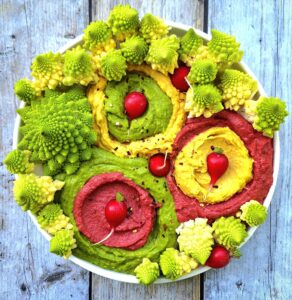 Ciecierzycę odsączamy i za pomocą blendera łączymy z masłem orzechowym, oliwą, czosnkiem, płatkami chili, kurkumą, solą oraz pieprzem. Jednolitą masę dzielimy na 3 części. Do jednej dodajemy buraka, do drugiej szpinak a trzecią odstawiamy na bok. Każdą blendujemy osobno, aby zachować wyraźne kolory. Wszystkie smaki rozsmarowujemy na talerzu. Podajemy z podzielonym na różyczki kalafiorem romanesco oraz rzodkiewkami.