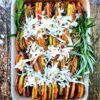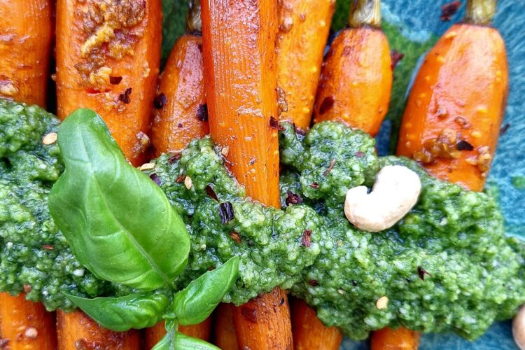 Wszystkie składniki pesto łączymy ze sobą za pomocą blendera (zostawiamy szczyty mięty oraz kilka orzechów do dekoracji). Marchewki obieramy i układamy w naczyniu żaroodpornym. Na wierzchu kładziemy masło, czosnek, polewamy syropem klonowym i sokiem z cytryny, oprószamy płatkami chili, kurkumą i solą. Wkładamy do piekarnika nagrzanego do temperatury 180 stopni C (góra, dół) na 40minut. W trakcie pieczenia polewamy powstałym sosem. Podajemy z pesto.